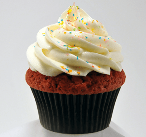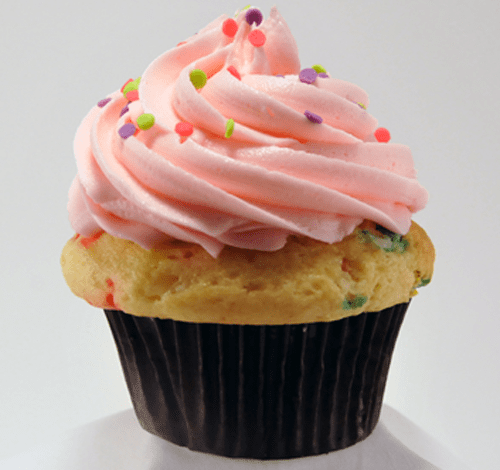Moiste vanilla cake infussed with sprinkles, topped with strawberry rich buttercream