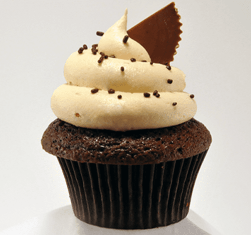 Moiste chocolate cake topped with creamy butter cream and a Resses peanutbutter cup