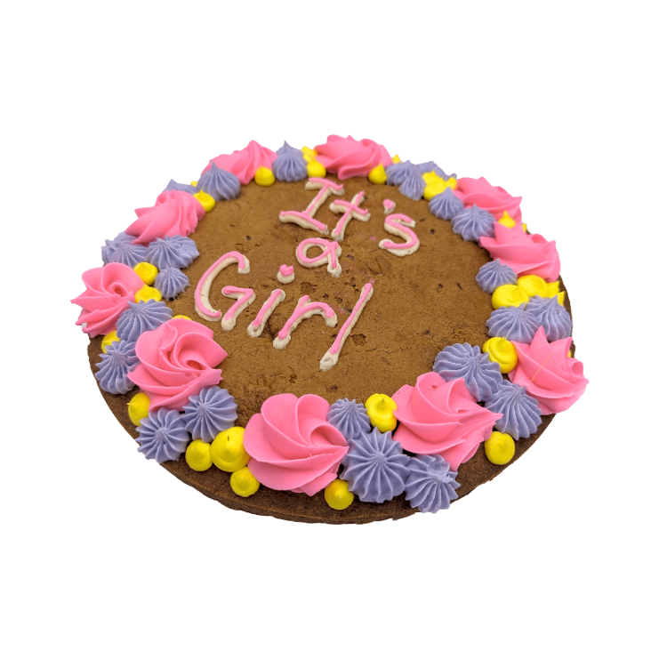 Welcome a new baby into the world with our Birth Announcement Cookie Cake. This charming 10-inch treat features a chocolate chip base and is decorated with adorable baby-themed designs.